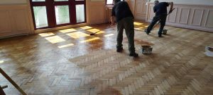 Après un ponçage méticuleux qui a permis de révéler la beauté naturelle du bois, la vitrification est en cours. Cette étape clé assure la protection du parquet contre l’usure tout en sublimant ses nuances chaleureuses. Le vernis en train de sécher laisse déjà entrevoir un sol éclatant, prêt à accueillir les pas de nombreux mariés.